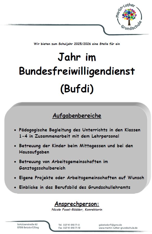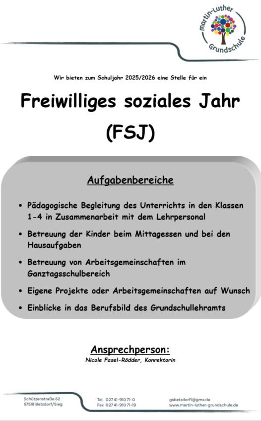 Unserer Schule bietet jährlich Plätze für ein (FSJ) Freiwilliges Soziales Jahr, für Bufdi (Bundesfreiwilligendienst) und ErzieherIn im Anerkennungsjahr. Falls Sie interessiert sind, kontaktieren Sie uns einfach!